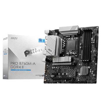 MSI Pro B760M-A DDR4 II (sk 1700) Chipset Intel B760 , Socket : 1700 ,CPU hỗ trợ: 14th Gen Intel Core, 13th Gen Intel Core,12th Gen Intel Core, Pentium Gold and Celeron Processors, Khe Ram : 4 khe cắm Ram , Dung lượng Ram hỗ trợ tối đa : 128GB , Tốc độ Bus : Memory Support 5333(OC)/ 5200(OC)/ 5066(OC)/ 5000(OC)/ 4800(OC)/ 4600(OC)/ 4400(OC)/ 4266(OC)/ 4200(OC)/ 4000(OC)/ 3800(OC)/ 3733(OC)/ 3600(OC)/ 3466(OC)/ 3400(OC)/ 3333(OC)/ 3200(JEDEC)/ 2933(JEDEC)/ 2666(JEDEC)/ 2400(JEDEC)/ 2133(JEDEC) , Cổng xuất hình : 2 x HDMI, 2 x DisplayPort , Wifi Không , Bluetooth Không , Kết nối mạng LAN : Realtek RTL8125BG 2.5G, Khe cắm : 2 x M.2, 4 x SATA 6G , Khe PCI : 2 x PCI-E x16, 1 x PCI-E x1 , Số cổng USB : 2 x USB 2.0 (Rear), 4 x USB 2.0 (Front), 2 x USB 3.2 Gen1 Type A (Rear), 4 x USB 3.2 Gen1 Type A (Front), 1 x USB 3.2 Gen1 Type C (Front), 2 x USB 3.2 Gen2 Type A (Rear) , Hệ điều hành hỗ trợ : Windows 11 64-bit, Windows 10 64-bit , Kích thước : mATX 243.84mm x 243.84mm